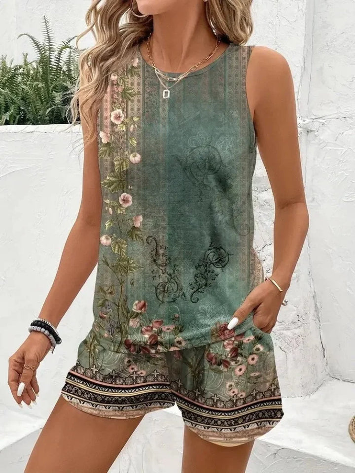 Kadın Askılı Yuvarlak Yaka çiçek Baskılı Süprme Bluz Ve Short Ikili Takım