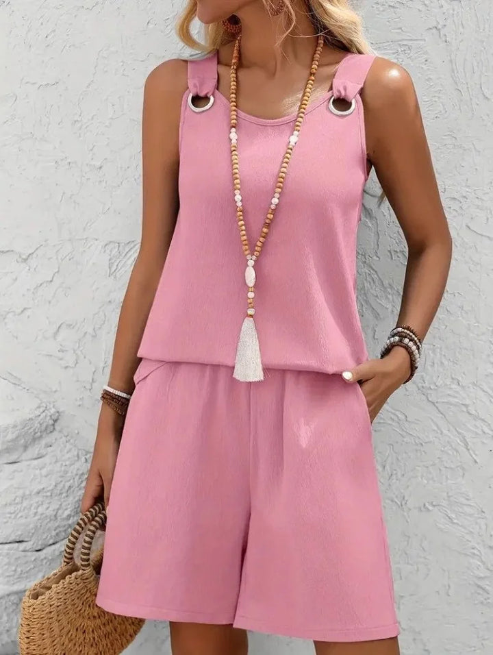 Kadın Askılı Yuvarlak Yaka Kuş Gözü Detaylı Bürümcük Bluz Ve Short Ikili Takım