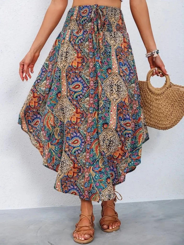 Kadın Beli Lastikli Bağcıklı Asimetrik Kesim Detaylı Desenli Bürümcük Etek