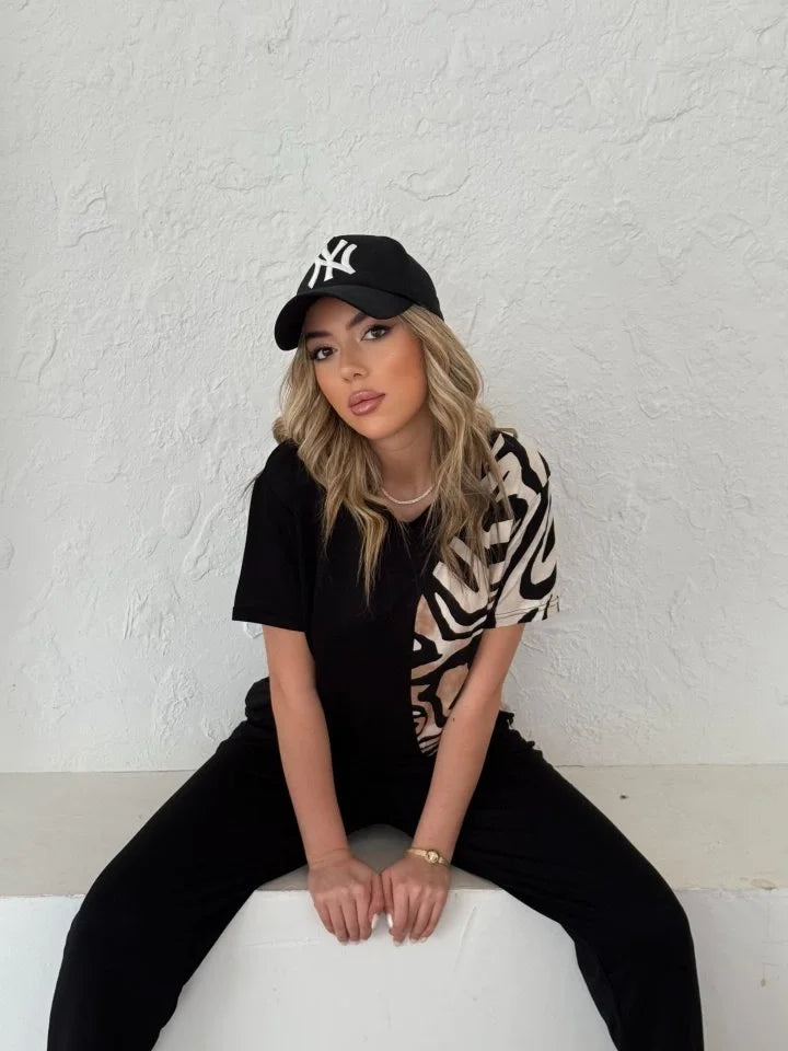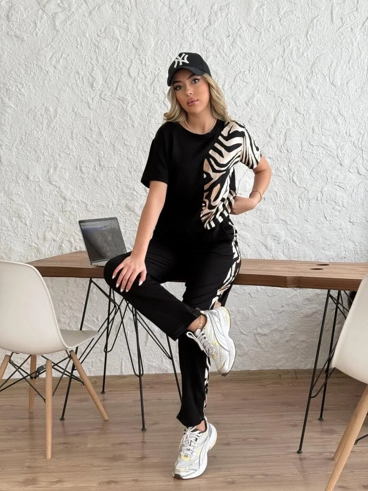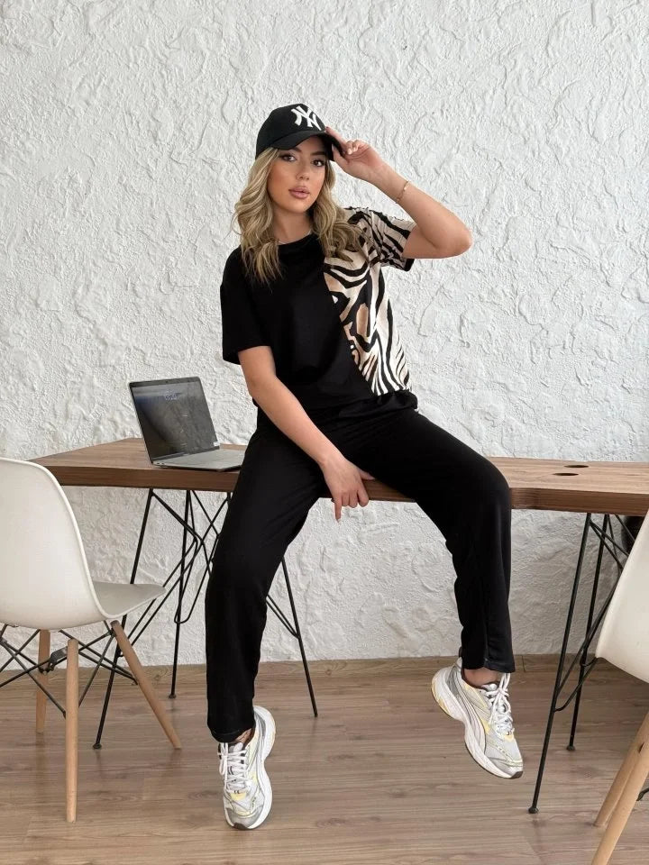 Kadın Bisiklet Yaka Kısa Kol Leopar Desen Bluz Ve Pantolon Ikili Takım