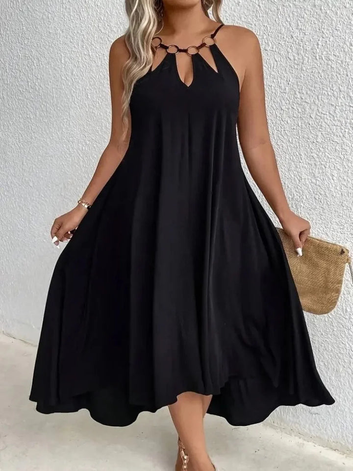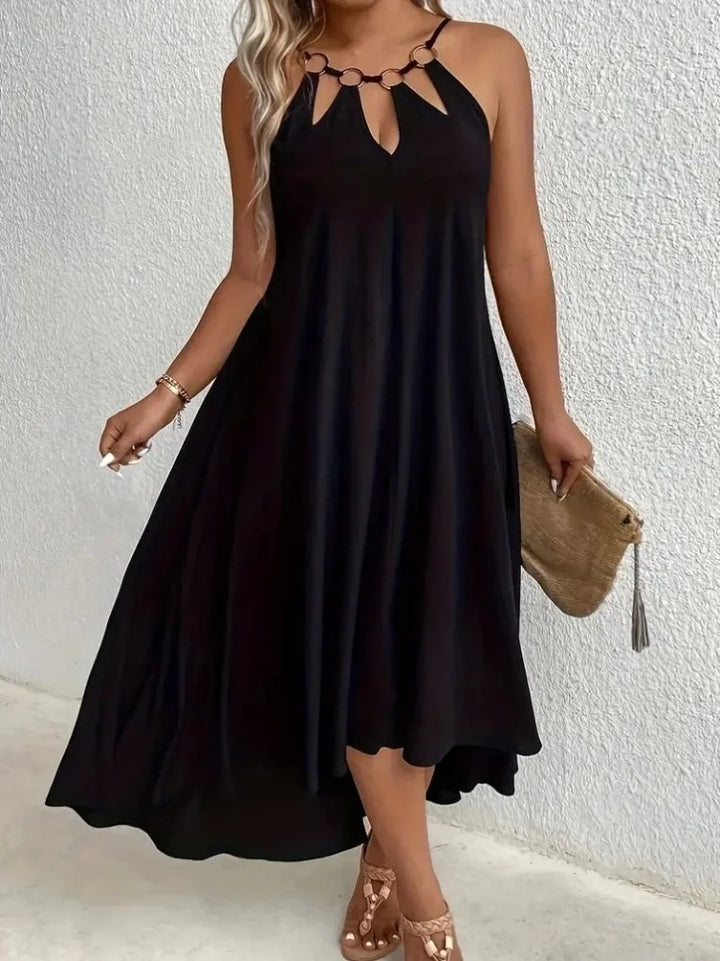 Kadın Boyundan Askılı Damla Detaylı Halkalı Asimetrik Kesim Viskon Elbise