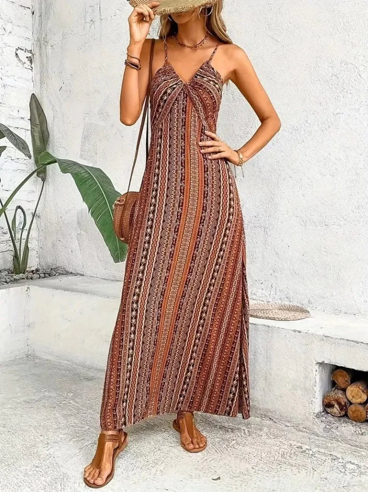 Kadın Ip Askılı Sırttan çapraz Detaylı Yırtmaçlı Desenli Süprem Elbise