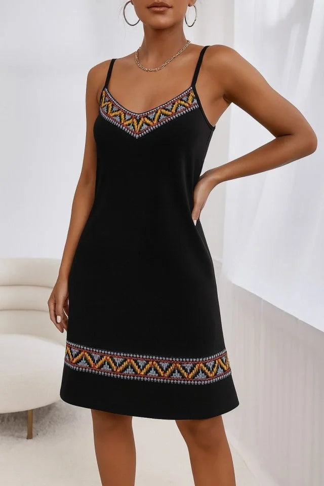 Kadın Ip Askılı V Yakalı Etnik Desenli Detaylı Elbise