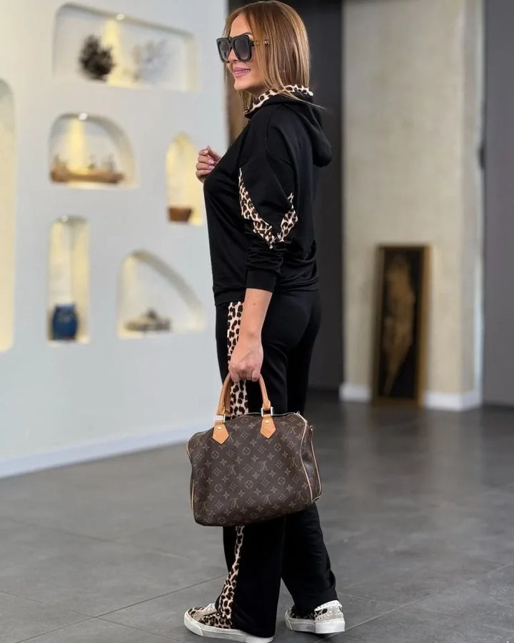 Kadın Kapüşonlu Leopar Detay Sweat Ve Yüksek Bel Yanları Leopar şeritli Bol Paça Pantolon Ikili Takım