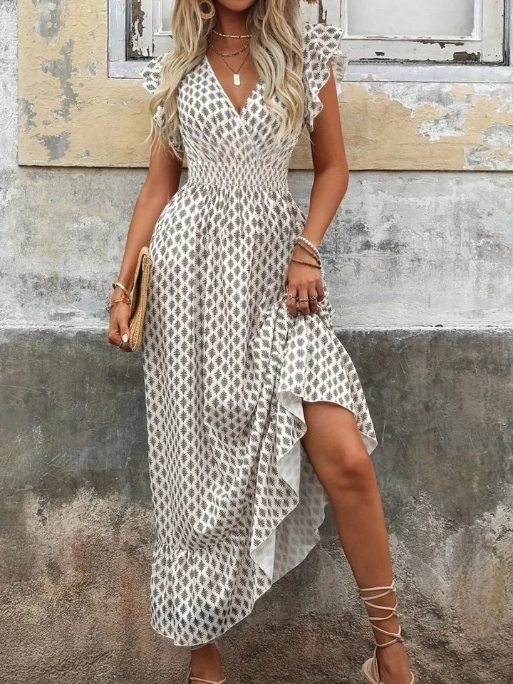 Kadın Kısa Kelebek Kollu Kruvaze Yakalı Desenli Süprem Elbise