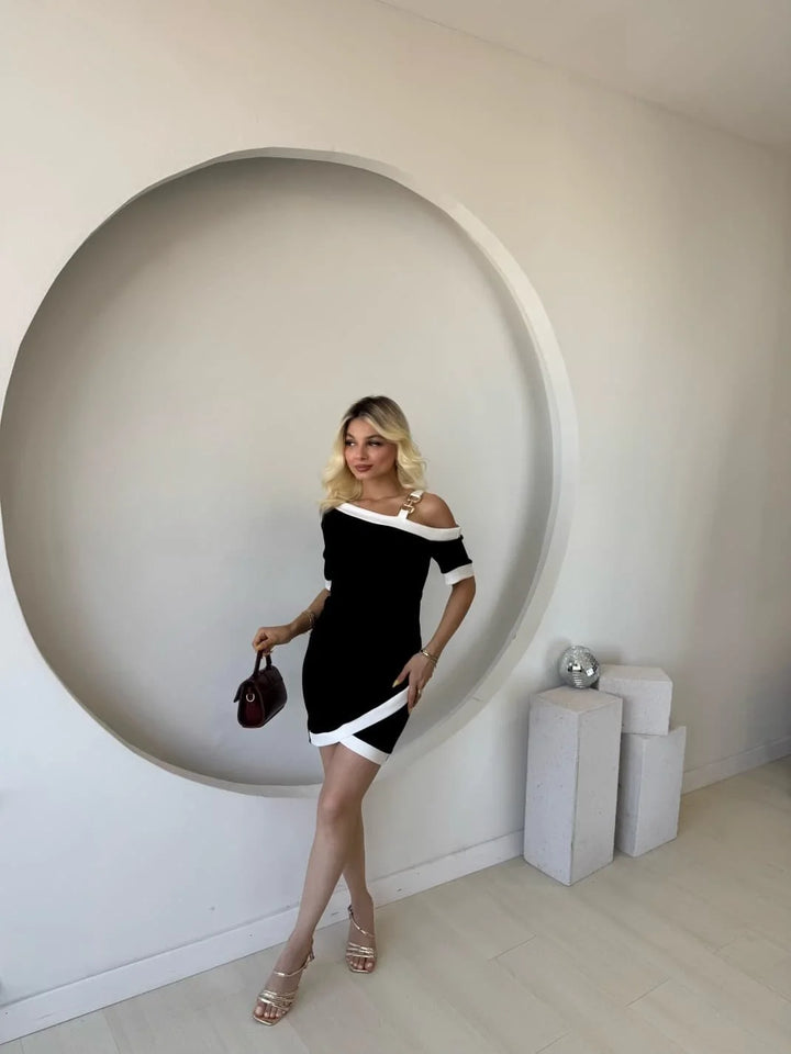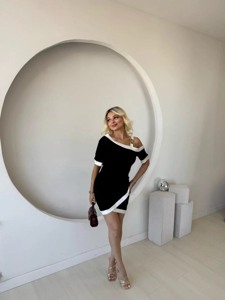 Kadın Kısa Kollu Asimetrik Kesim Yaka şerit Ve Aksesuar Detaylı Modal Elbise