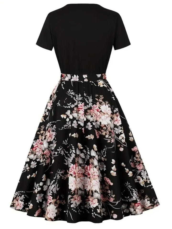 Kadın Kısa Kollu Bisiklet Yaka çiçek Desenli üst Viskon Alt Süprem Kısa Elbise
