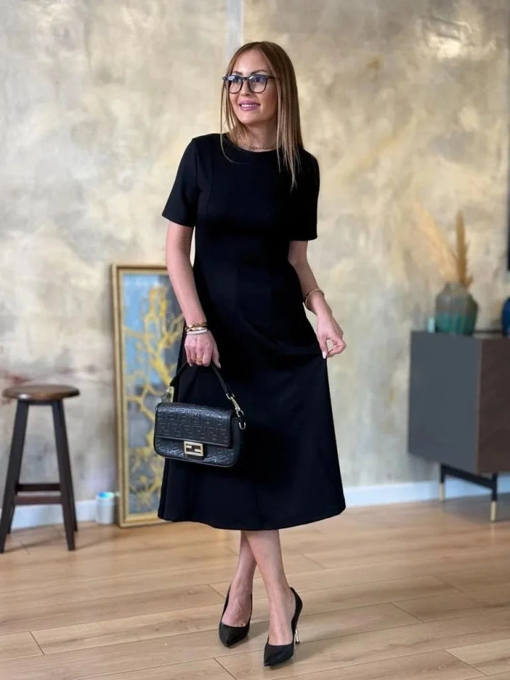 Kadın Kısa Kollu Bisiklet Yaka Midi Viskon Iki Iplik Elbise