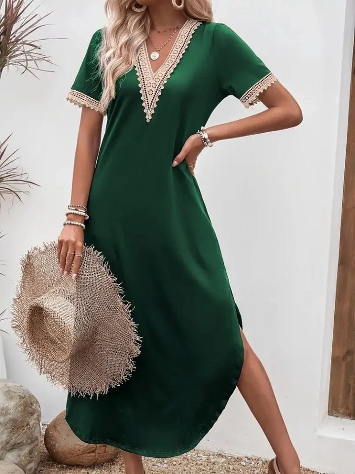 Kadın Kısa Kollu Dantel V Yakalı Uzun Viskon Elbise