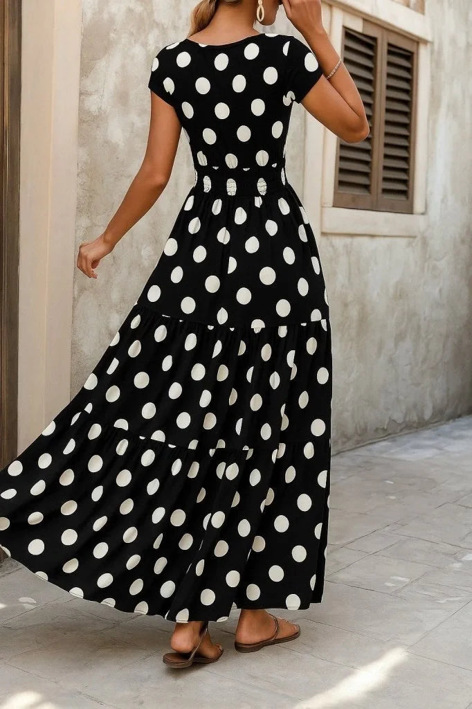 Kadın Kısa Kollu Kruvaze Yaka Beli Lastikli Süprem Maksi Boy Elbise