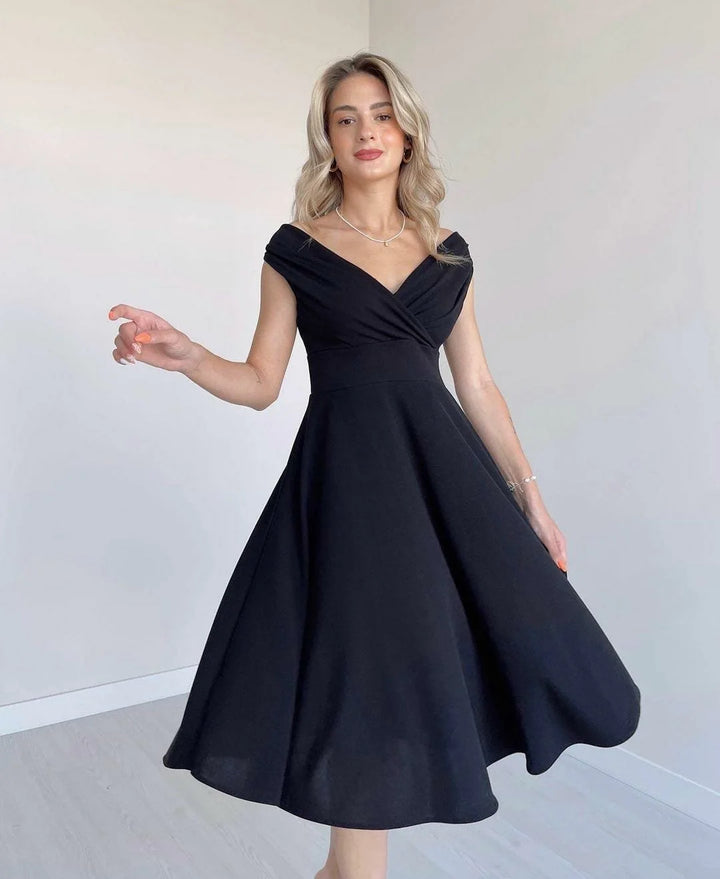 Kadın Kısa Kollu Kruvaze Yaka Eteği Volanlı Krep Elbise