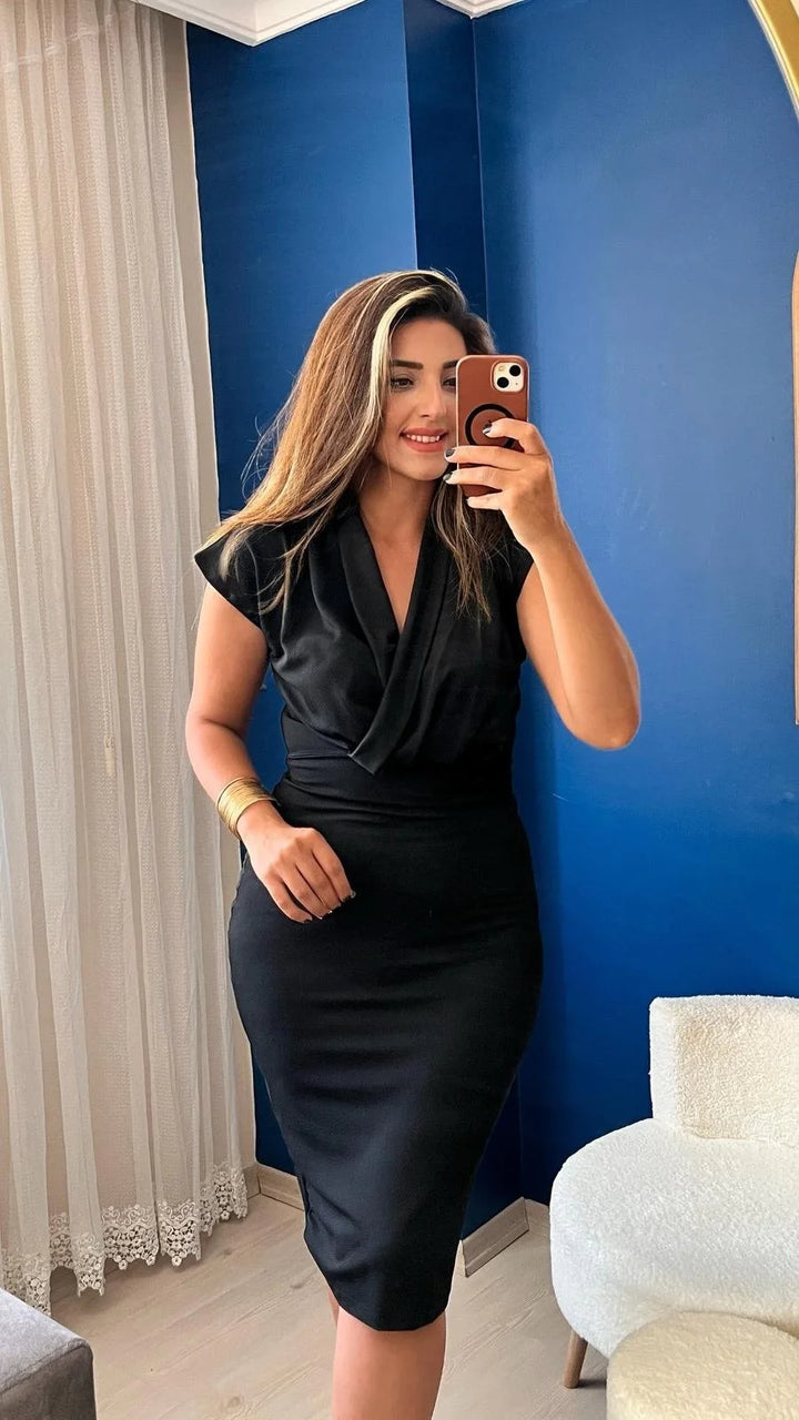 Kadın Kısa Kollu Kruvaze Yaka Krep Elbise (Kemersiz)