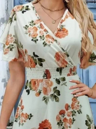Kadın Kısa Kollu Kruvaze Yakalı Desenli Süprem Kısa Elbise