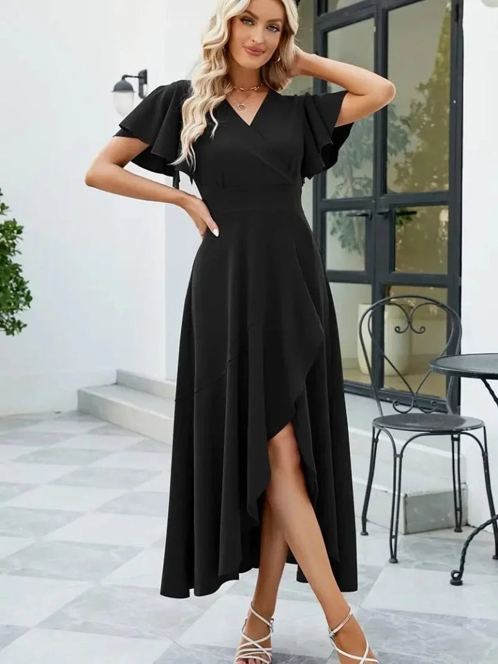 Kadın Kısa Kollu Kruvaze Yakalı önden Volanlı çapraz Kesim Detaylı Maksi Boy Ithal Krep Elbise