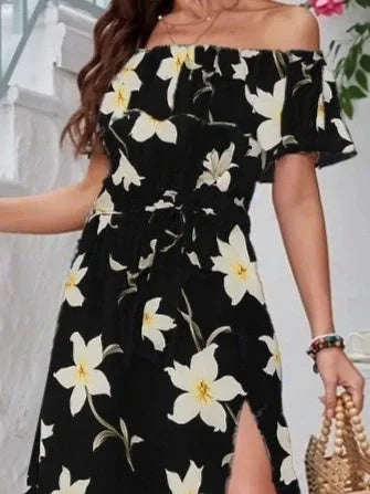 Kadın Kısa Kollu Madonna Yaka Fırfırlı Belden Yırtmaçlı Maksi örme Krep Elbise