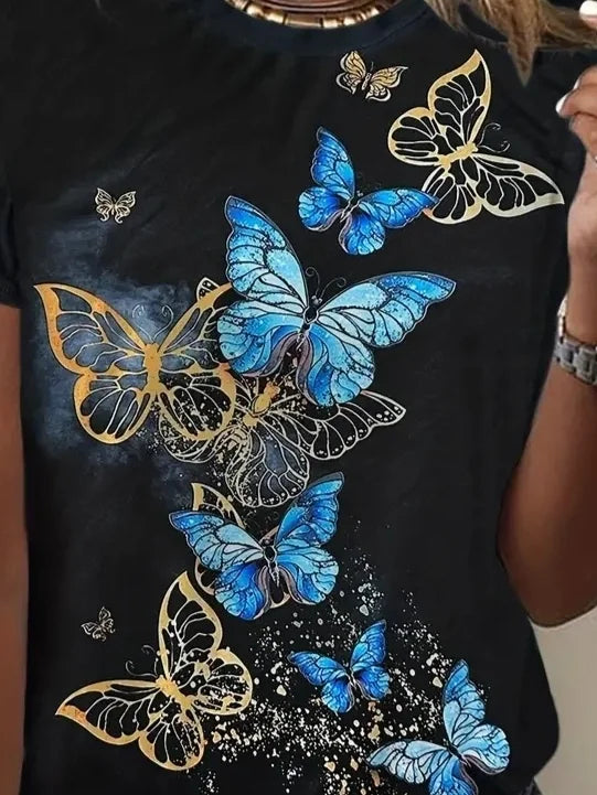 Kadın Kısa Kollu Mavi Sarı Kelebek Baskı Süprem T-shirt