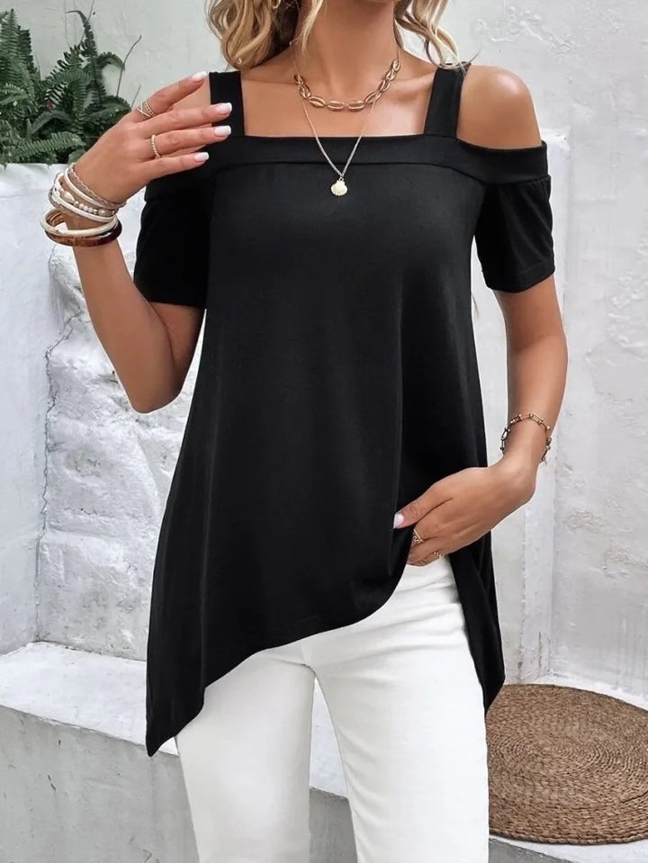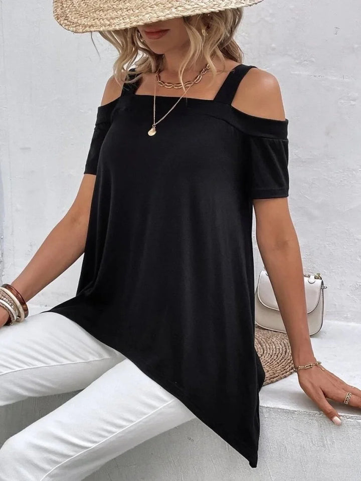 Kadın Kısa Kollu Omuzlardan Açık Askılı Asimetrik Kesim Viskon Bluz