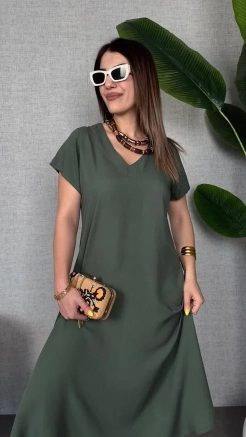 Kadın Kısa Kollu V Yaka Salaş Maxi Boy Elbise
