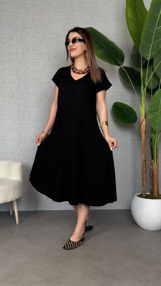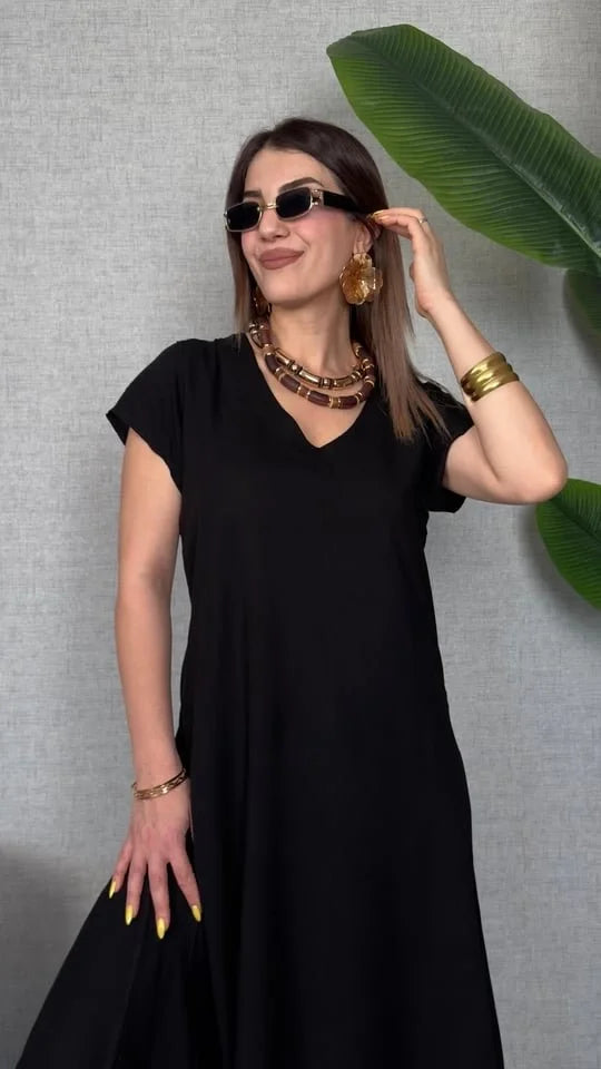 Kadın Kısa Kollu V Yaka Salaş Maxi Boy Elbise