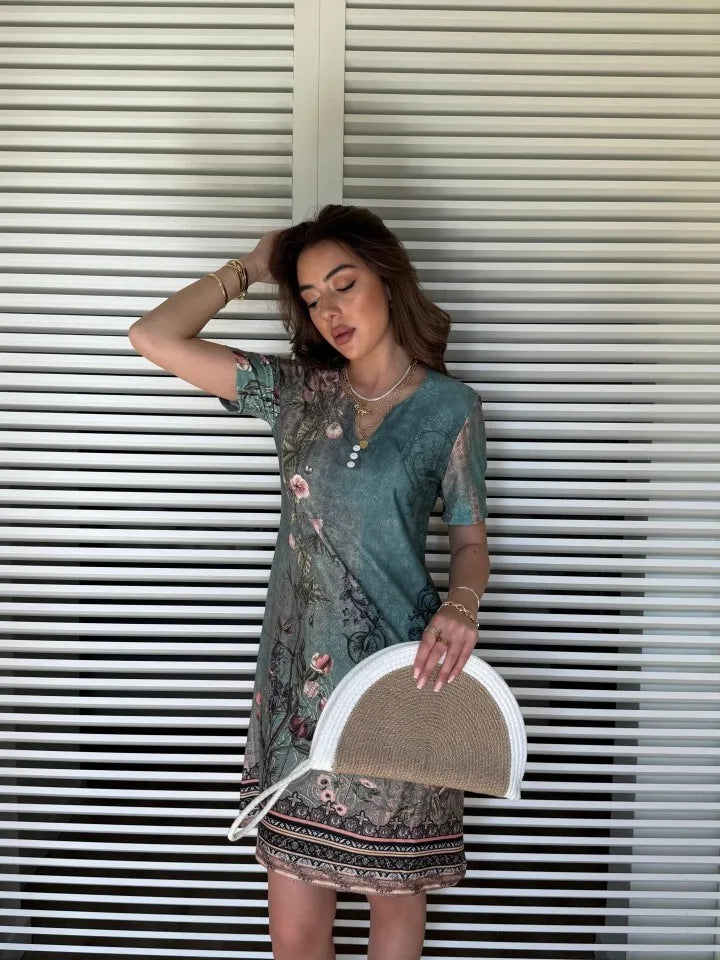 Kadın Kısa Kollu V Yakalı çiçek Baskılı Midi Süprem Elbise
