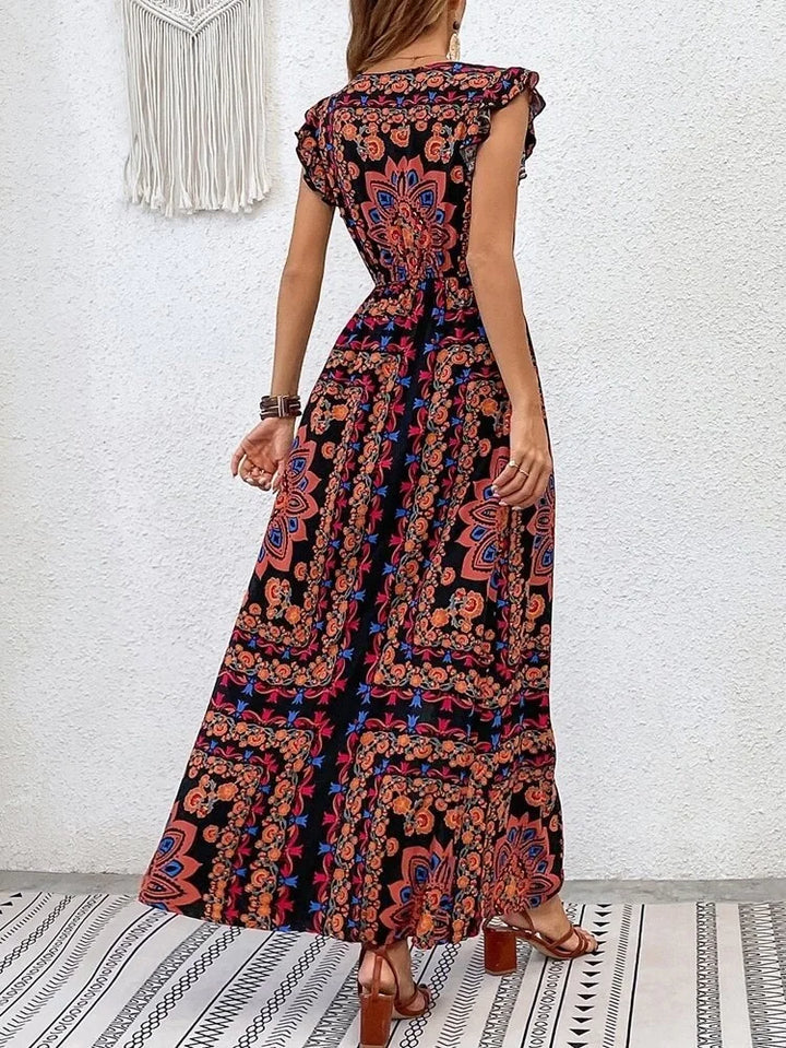 Kadın Kısa Kollu V Yakalı Deseni Yırtmaçlı Süprem Elbise