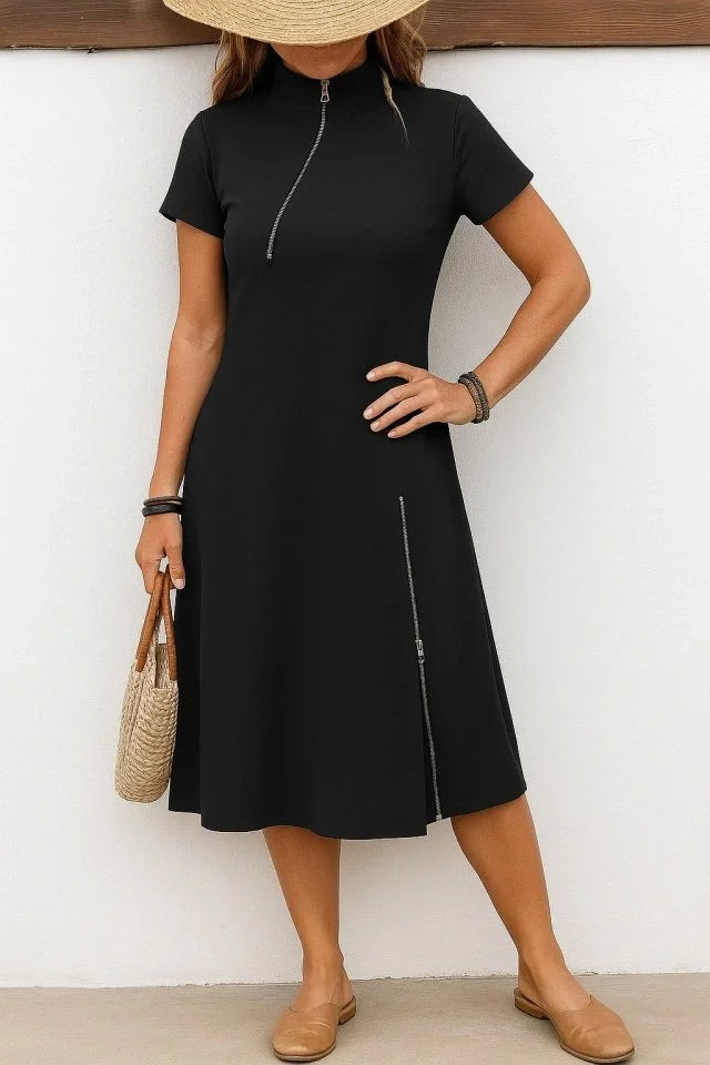 Kadın Kısa Kollu Yakadan Ve Etekten Fermuarlı Midi Viskon Iki Iplik Elbise