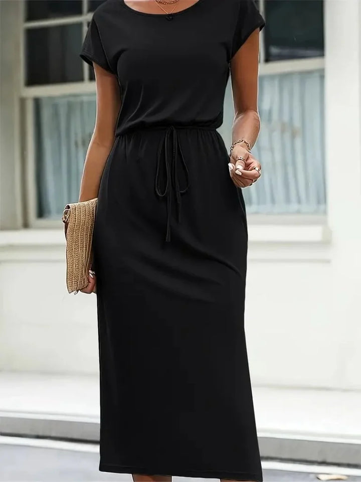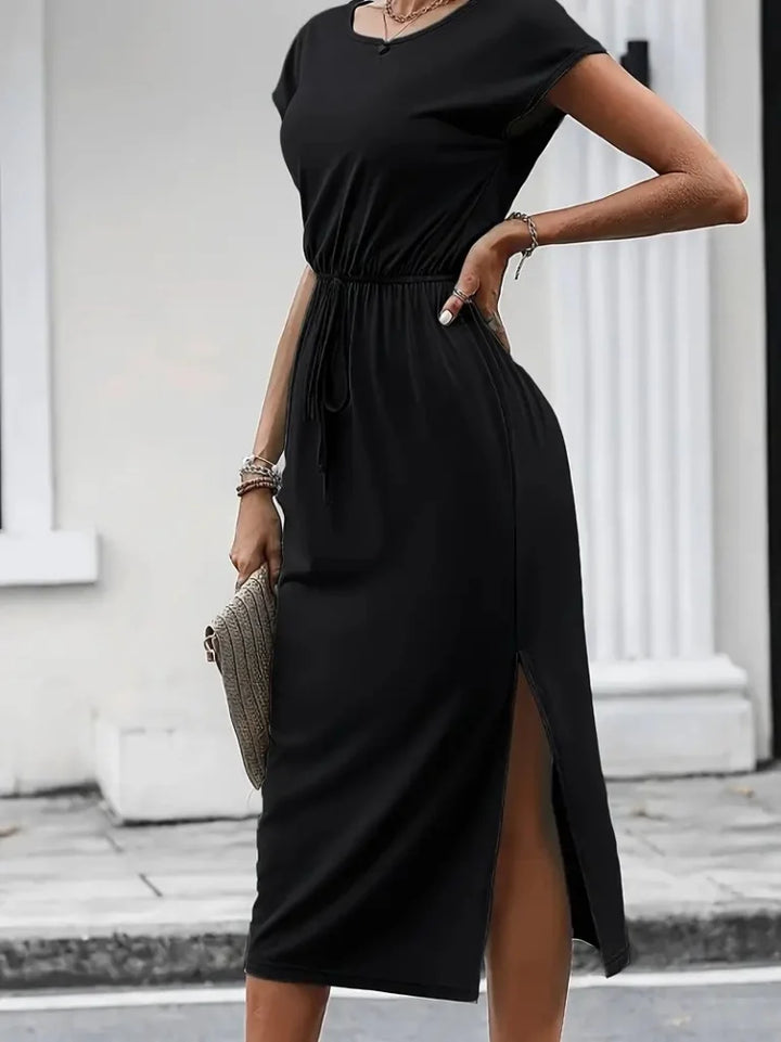 Kadın Kısa Kollu Yakası Açık Belden Kuşaklı Yandan Yırtmaçlı Midi Viskon Elbise