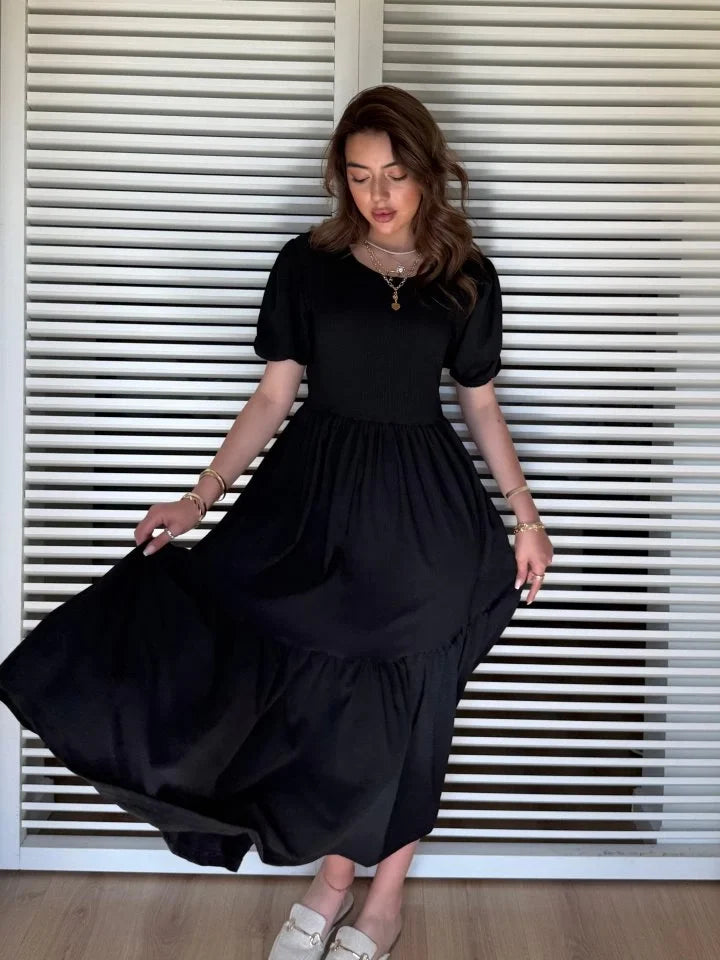 Kadın Kısa Kollu Yakası Açık Katlı Bürümcük Balon Elbise