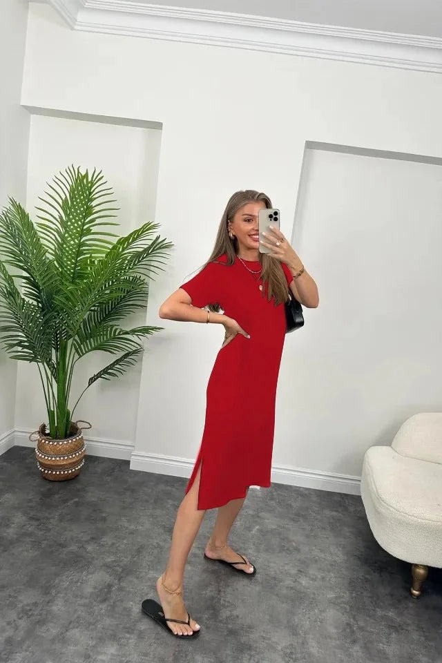 Kadın Kısa Kollu Yırtmaç Detaylı Salaş Viskon Elbise