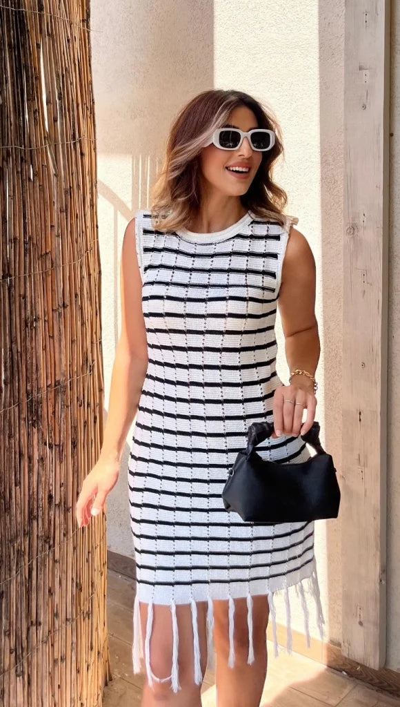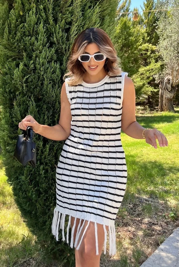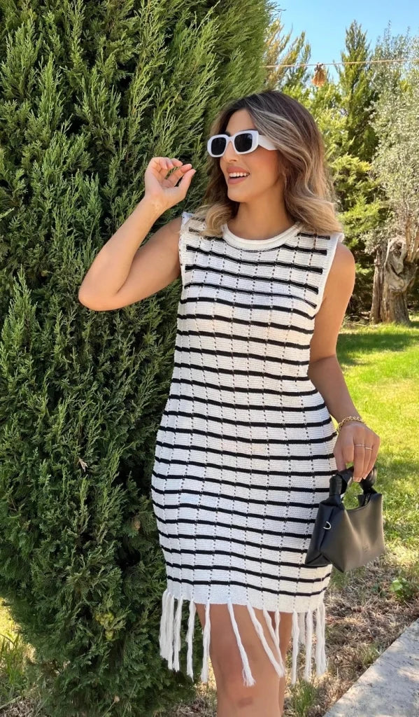Kadın Kolsuz V Yaka Eteği Püsküllü çizgi Desen Triko Elbise