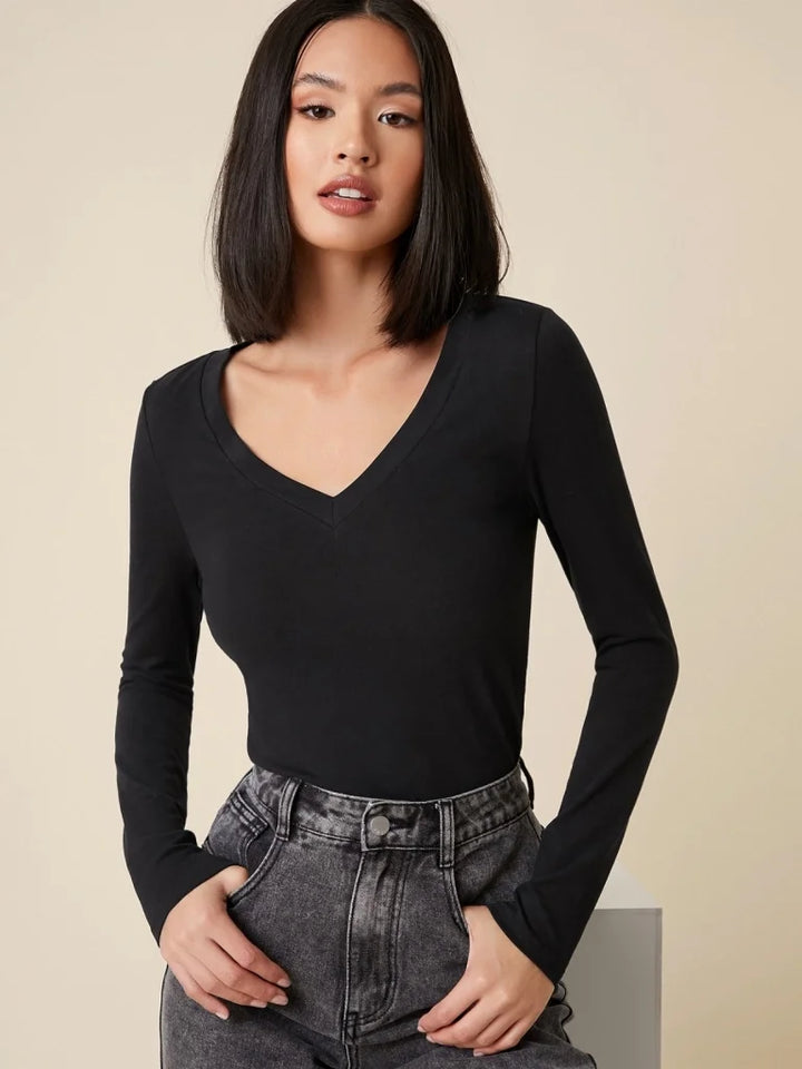 Kadın Siyah V Yaka Uzun Kollu Bluz