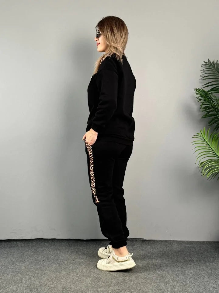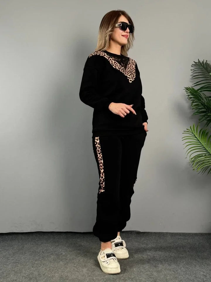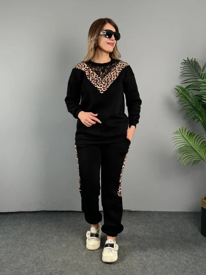 Kadın üç Iplik Kumaş Leopar Desenli Dantel Detaylı Ikili Takım