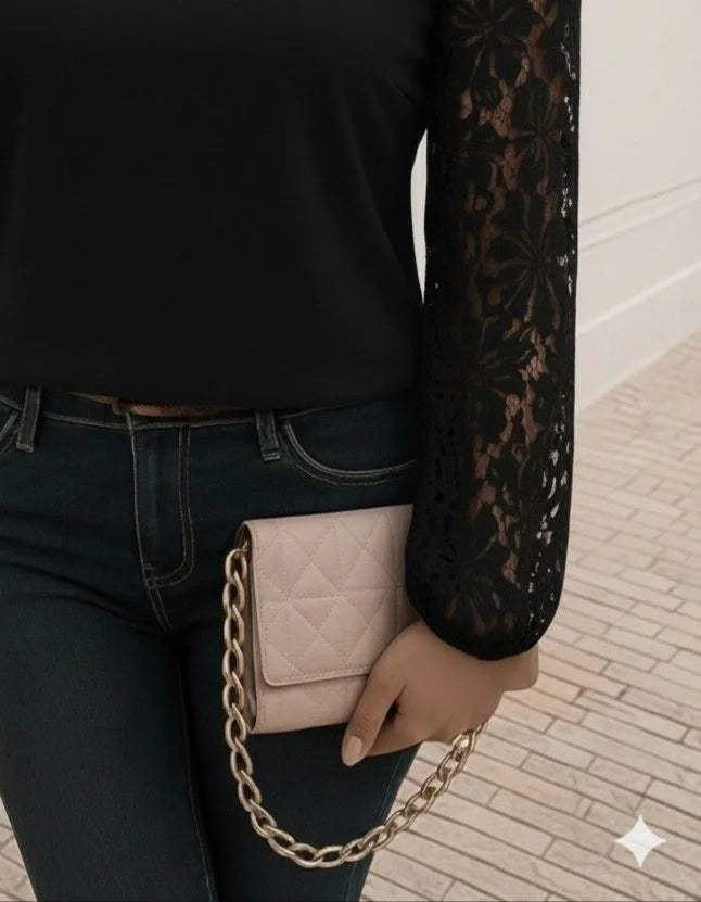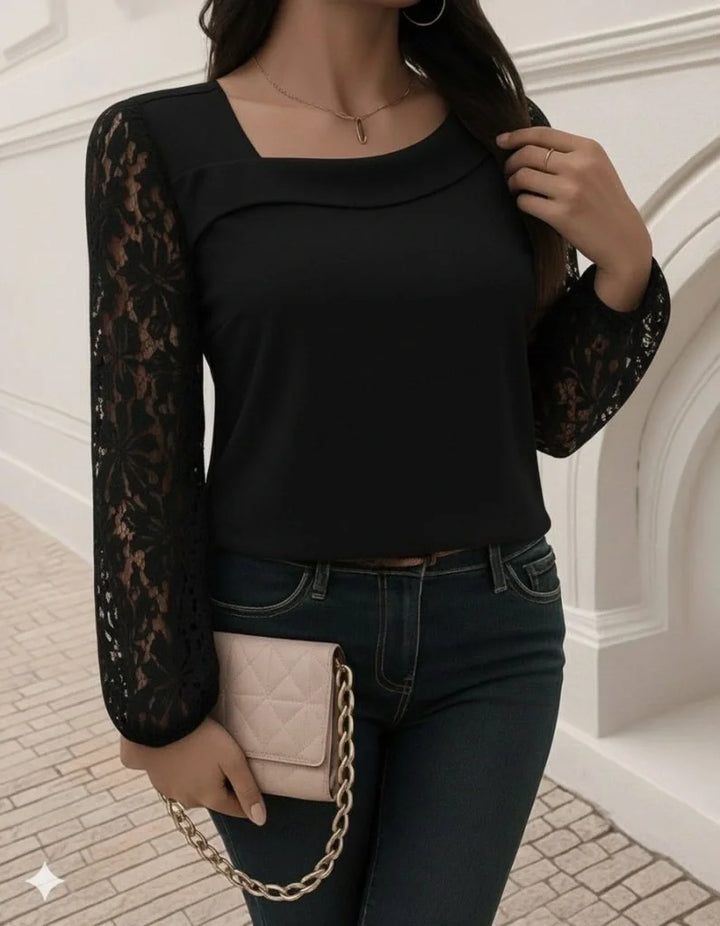 Kadın Uzun Kollu Asimetrik Yakalı Dantelli Ithal Krep Bluz