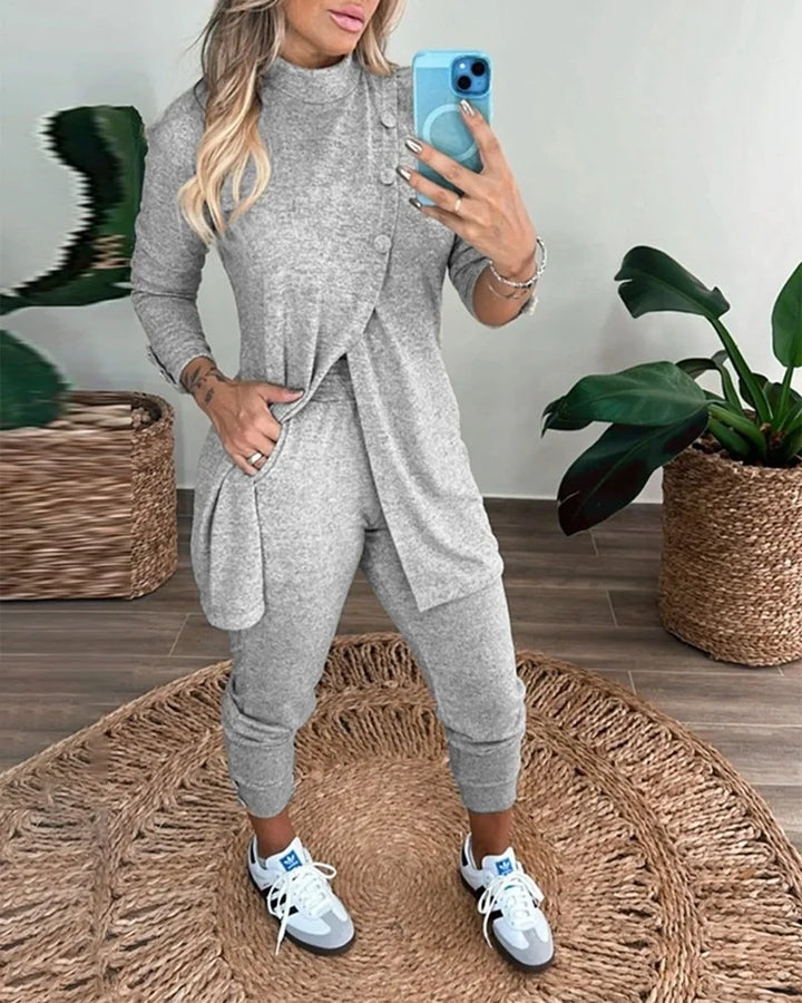 Kadın Uzun Kollu Balıkçı Yaka önden Düğmeli Bluz Ve Pantolon Yumoş Ikili Takım