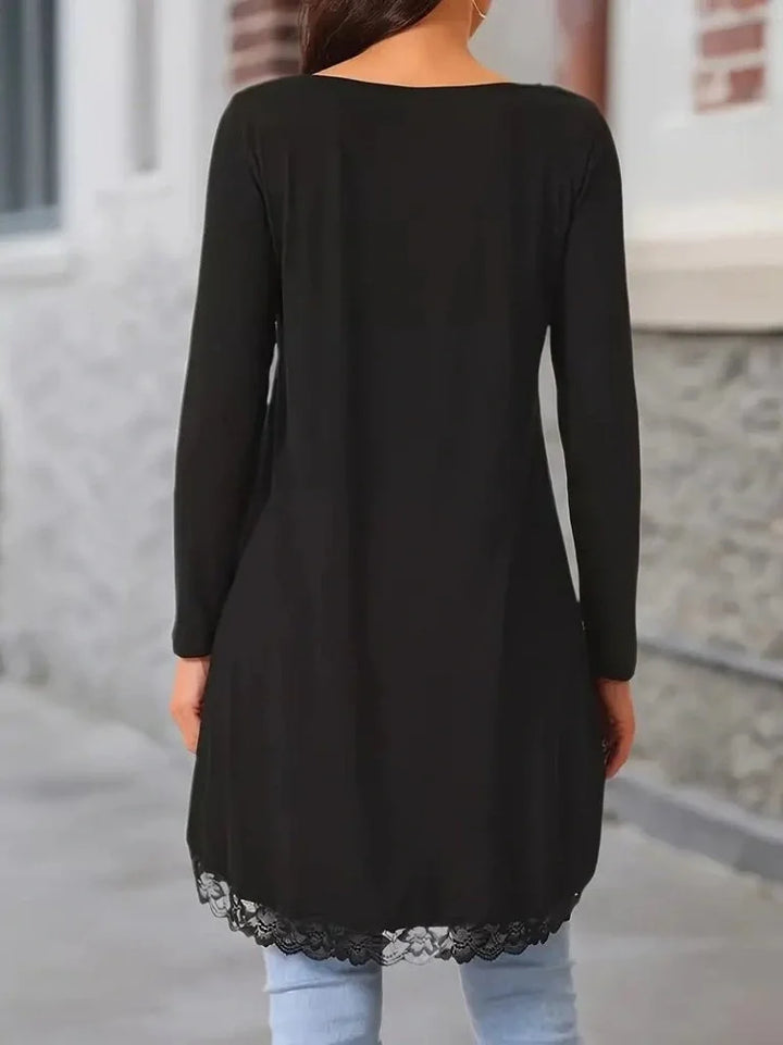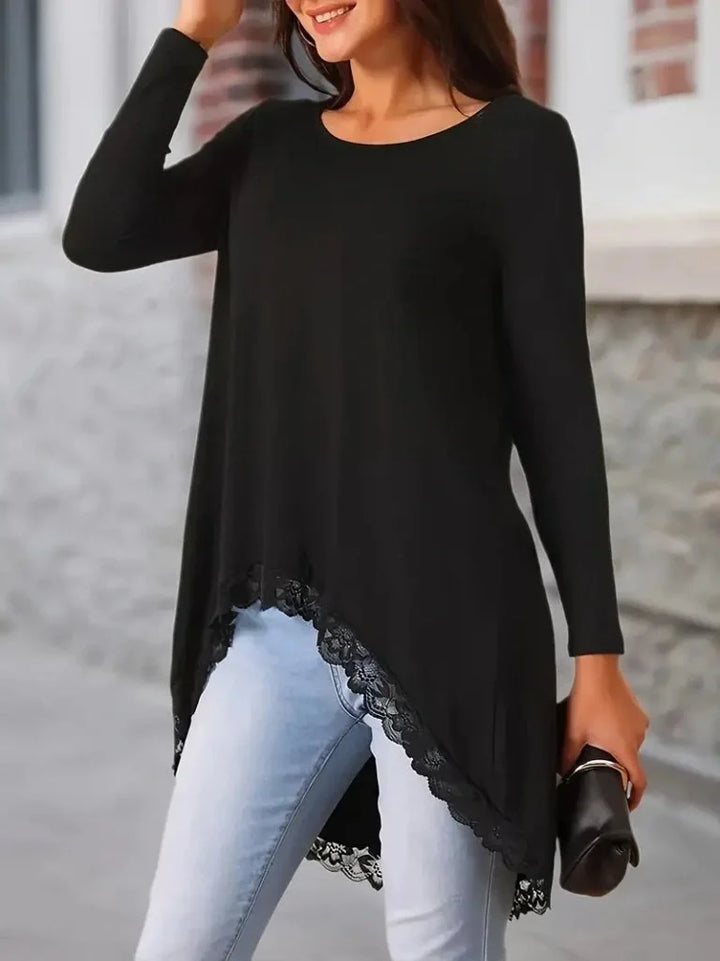 Kadın Uzun Kollu Bisiklet Yaka Asimetrik Kesim Detaylı Dantelli Viskon Bluz