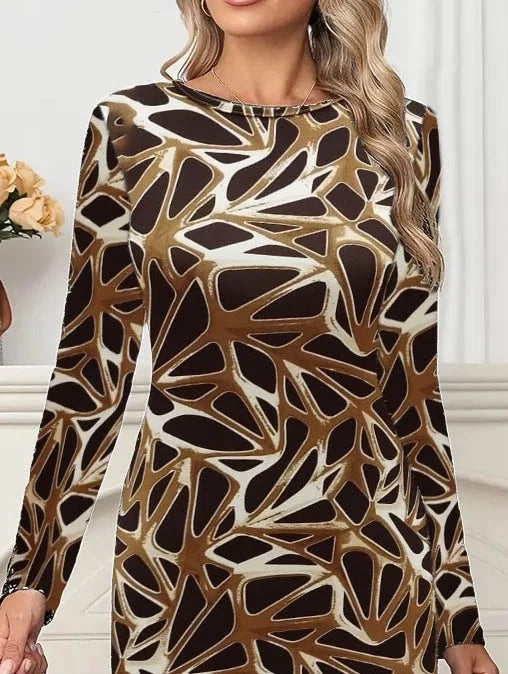 Kadın Uzun Kollu Bisiklet Yaka Desenli Dalgıç Kısa Elbise
