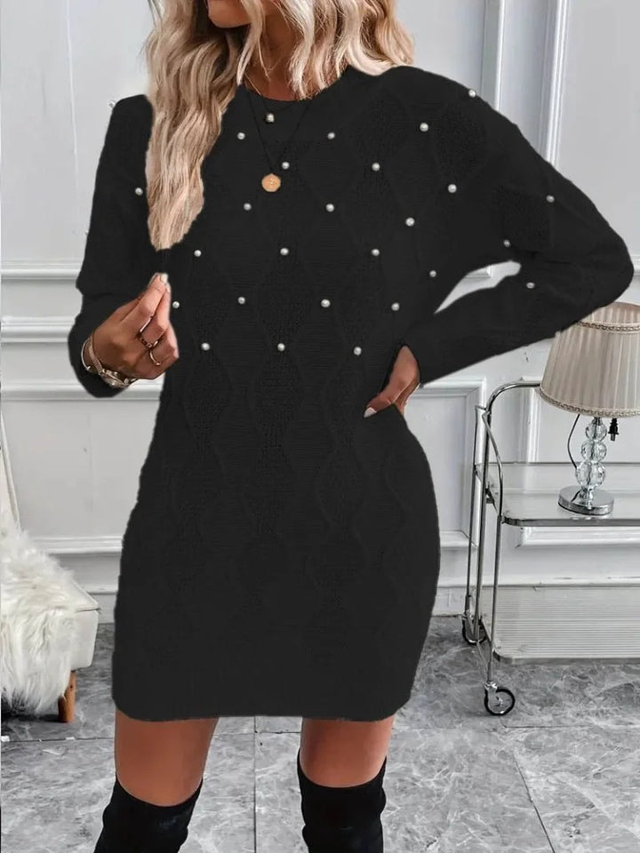 Kadın Uzun Kollu Bisiklet Yaka Desenli Triko Elbise