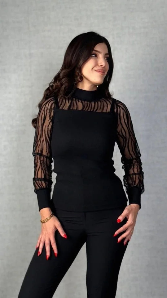 Kadın Uzun Kollu Bisiklet Yaka Kolları Tül Detay Kaşkorse Kumaş Bluz