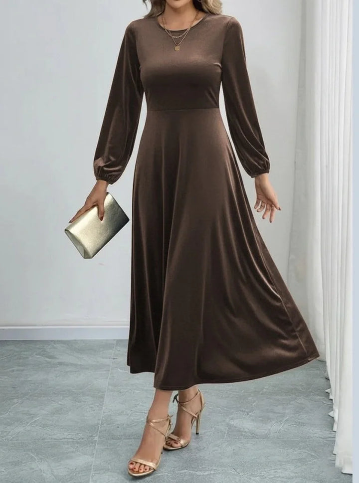 Kadın Uzun Kollu Bisiklet Yaka Midi Kadife Elbise