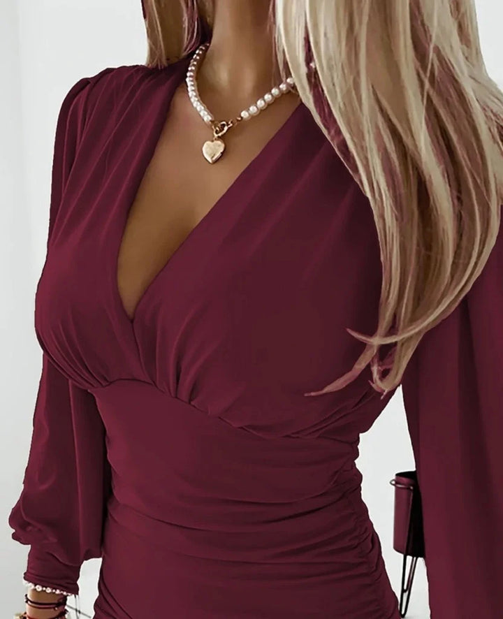 Kadın Uzun Kollu Derin V Yakalı önden Büzgülü Sandy Bluz
