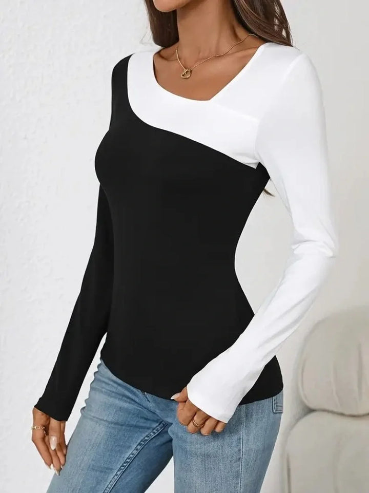 Kadın Uzun Kollu Geometrik Yaka Detaylı çift Renkli Viskon Bluz