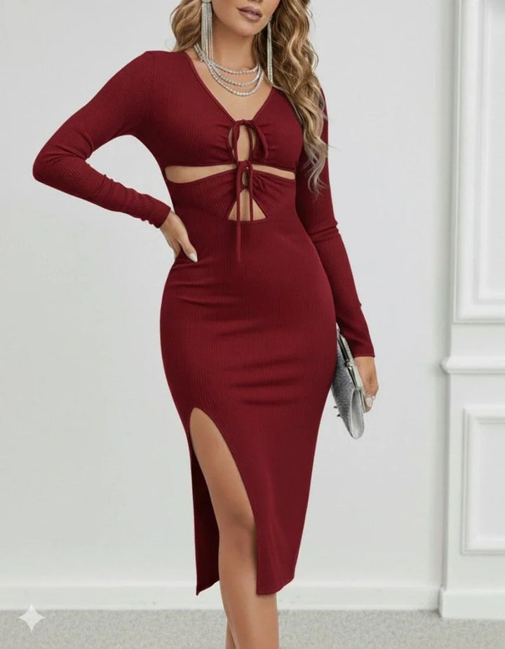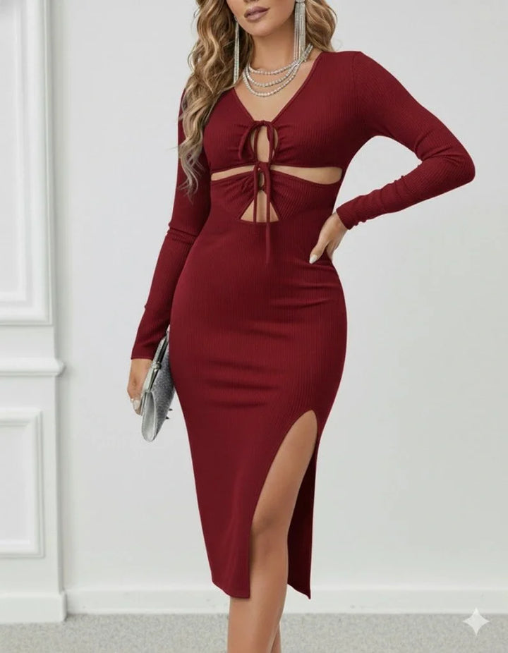 Kadın Uzun Kollu Göğüs Ve Göbek Dekolte Detay Sandy Midi Boy Elbise