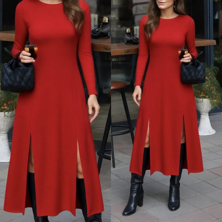 Kadın Uzun Kollu Hafif Kayık Yaka Sırt Dekolteli Yırtmaç Detaylı Viskon Tam Boy Elbise