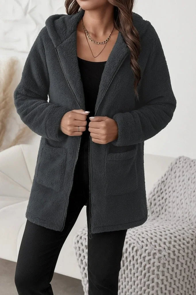 Kadın Uzun Kollu Kapşonlu önden Fermuarlı Cepli Welsoft Ceket