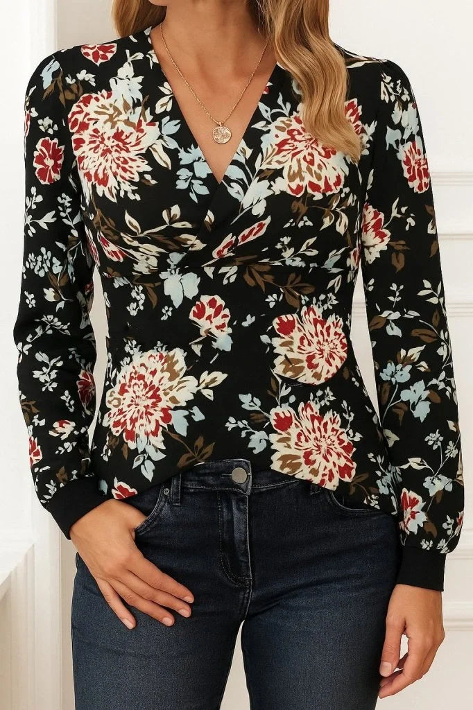 Kadın Uzun Kollu Kruvaze Yakalı Kelebek Desenli şardonlu Dalgıç Bluz