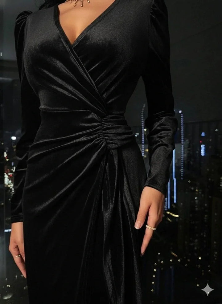 Kadın Uzun Kollu Kruvaze Yakalı Yandan Büzgülü Midi Kadife Elbise