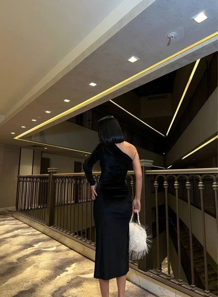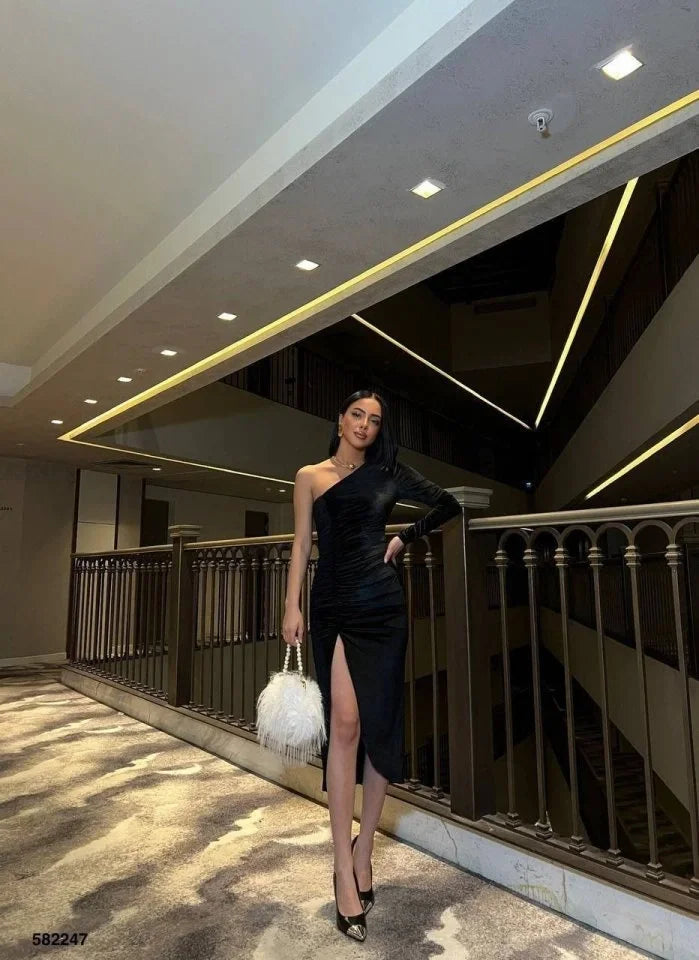 Kadın Uzun Kollu Omuz Dekolteli Büzgü Ve Asimetrik Yırtmaç Detay Elbise