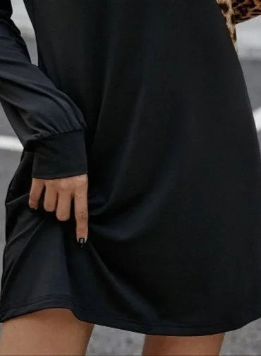 Kadın Uzun Kollu Omuzdan Açık Leopar Desenli Viskon Iki Iplik Mini Elbise