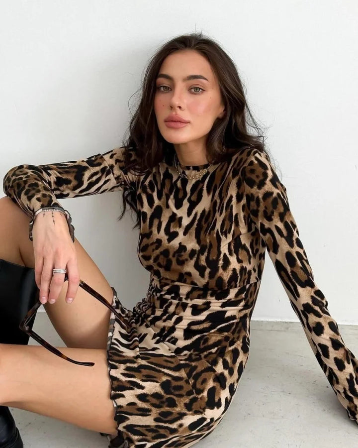 Kadın Uzun Kollu Sırtı Açık Bağlamalı Leopar Desenli Kısa Dalgıç Elbise