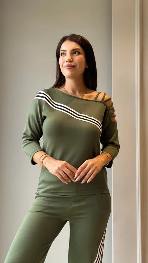 Kadın Uzun Kollu Truvakar Kol Tek Omuz çapraz şerit Detaylı Ribanalı Viskon Iki Iplik Bluz Ve Pantolon Ikili Takım
